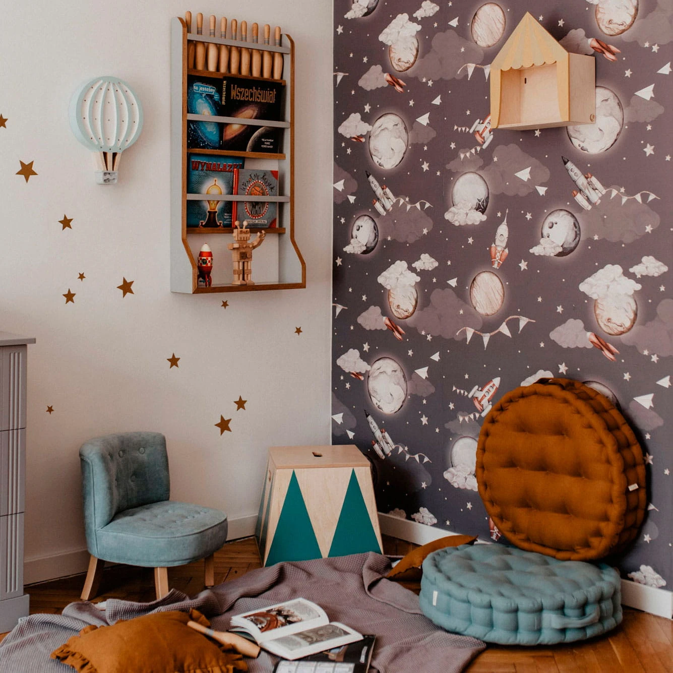 - Kolor nieba: zgaszony niebieski, prawie granat, jednak bardziej zgaszony. Nie jest to super intensywny kolor. Zbudowaliśmy tę barwę tak, aby nie kontrastowała za bardzo z białymi meblami, a także aby pasowała do mebli w kolorze naturalnym (sosna, wiklina).