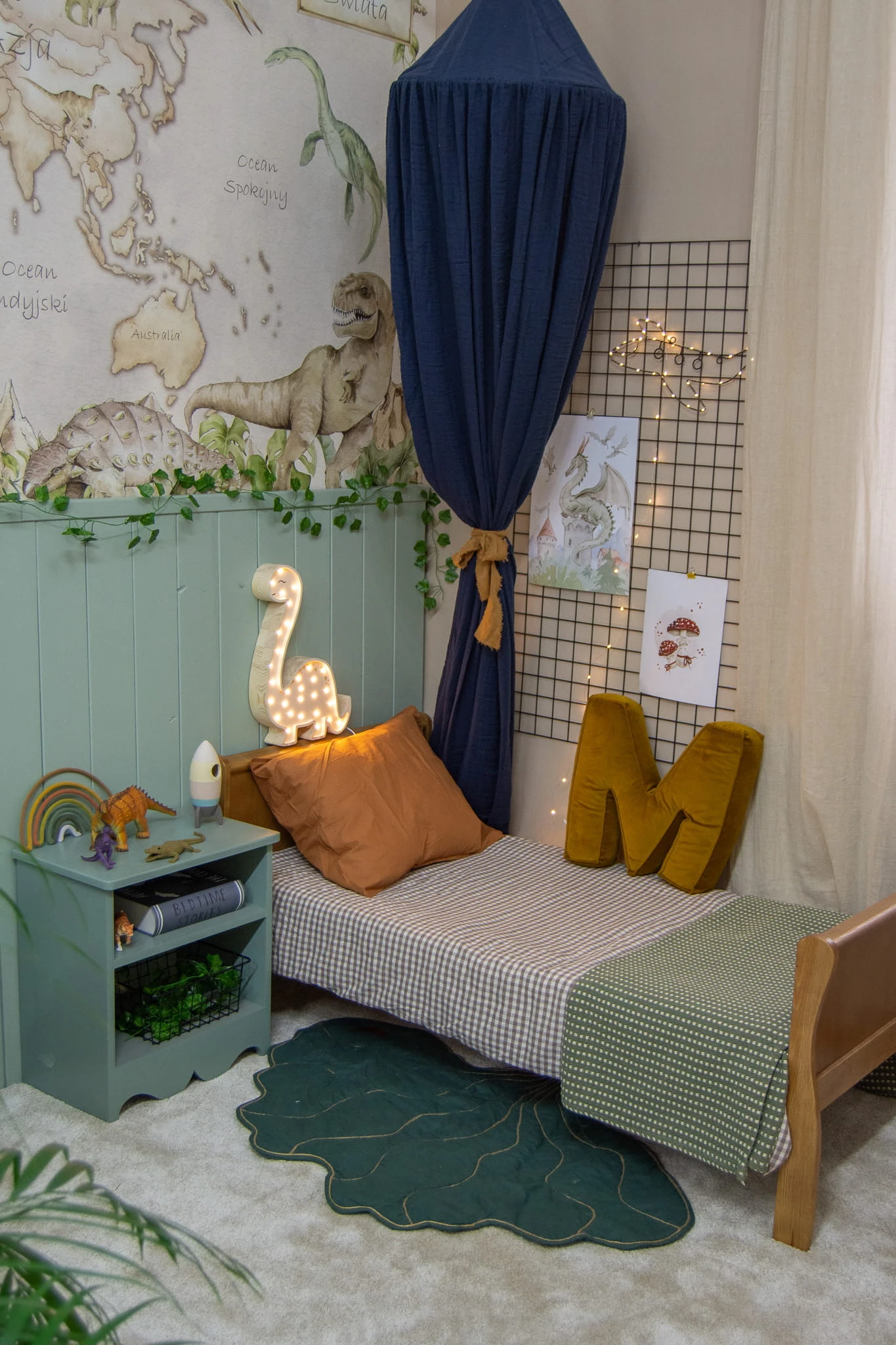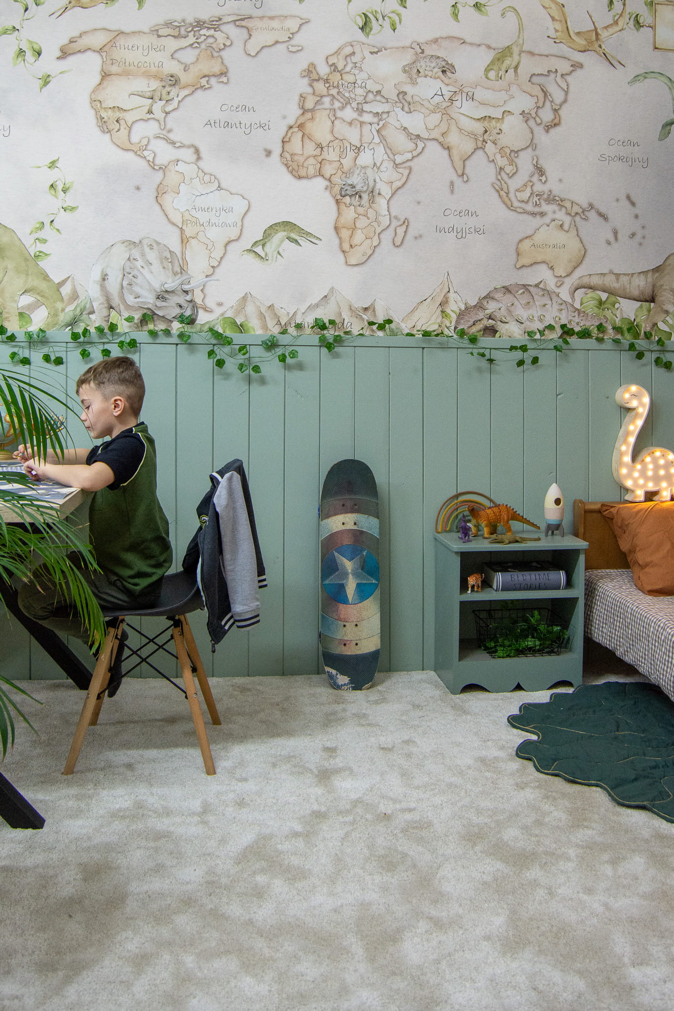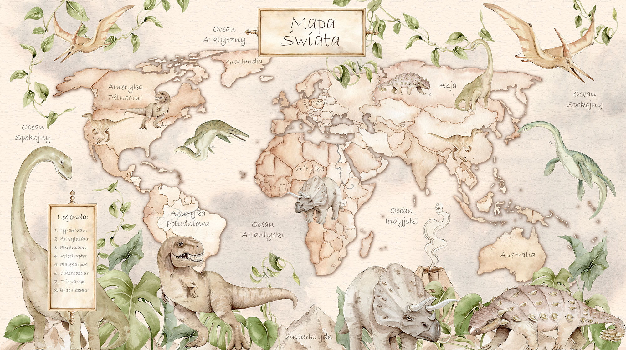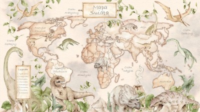 Tapeta-mapa świata z dinozaurami zachęci Twoje dziecko do odkrywania najdalszych zakamarków planety – w rzeczywistości i w wyobraźni.