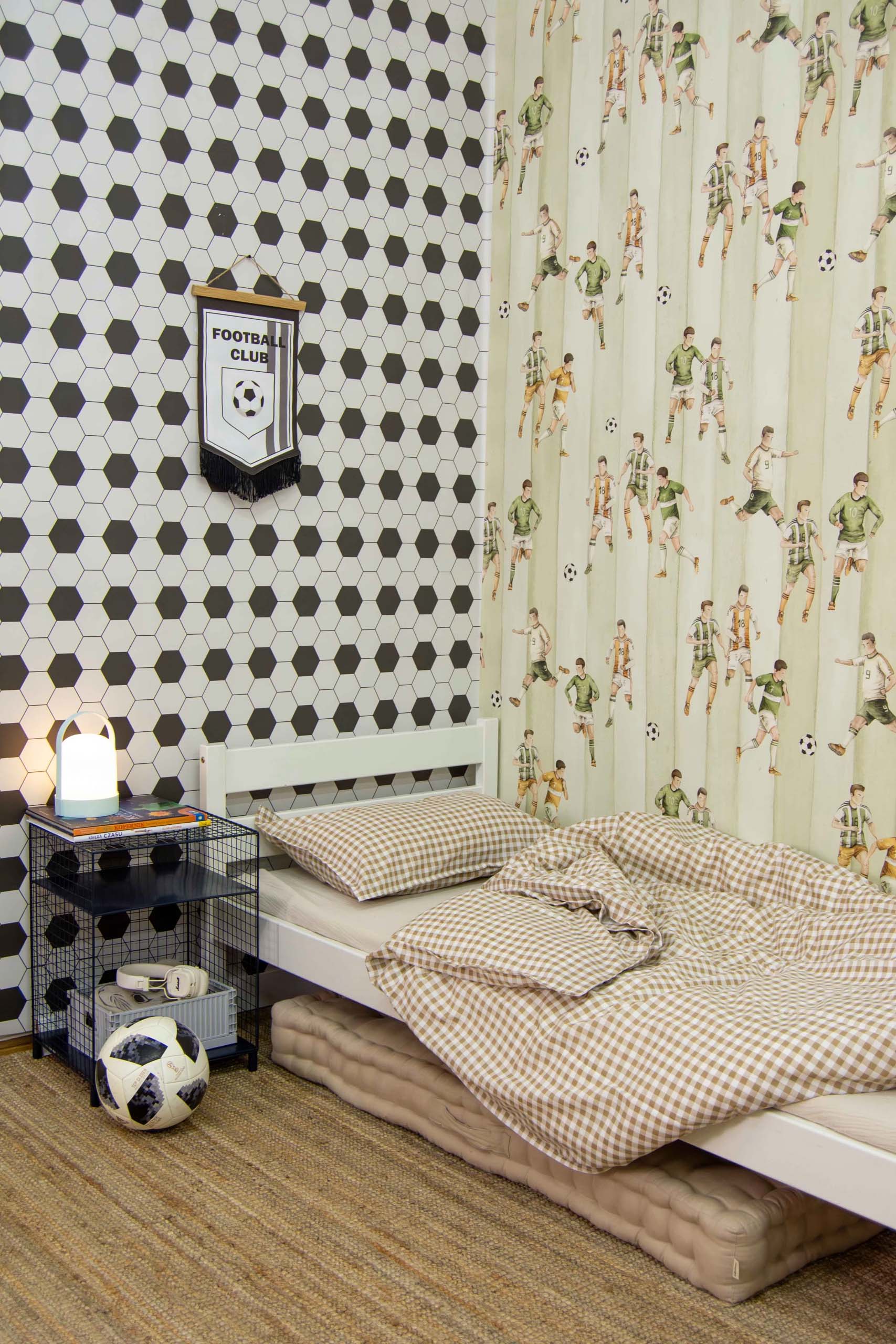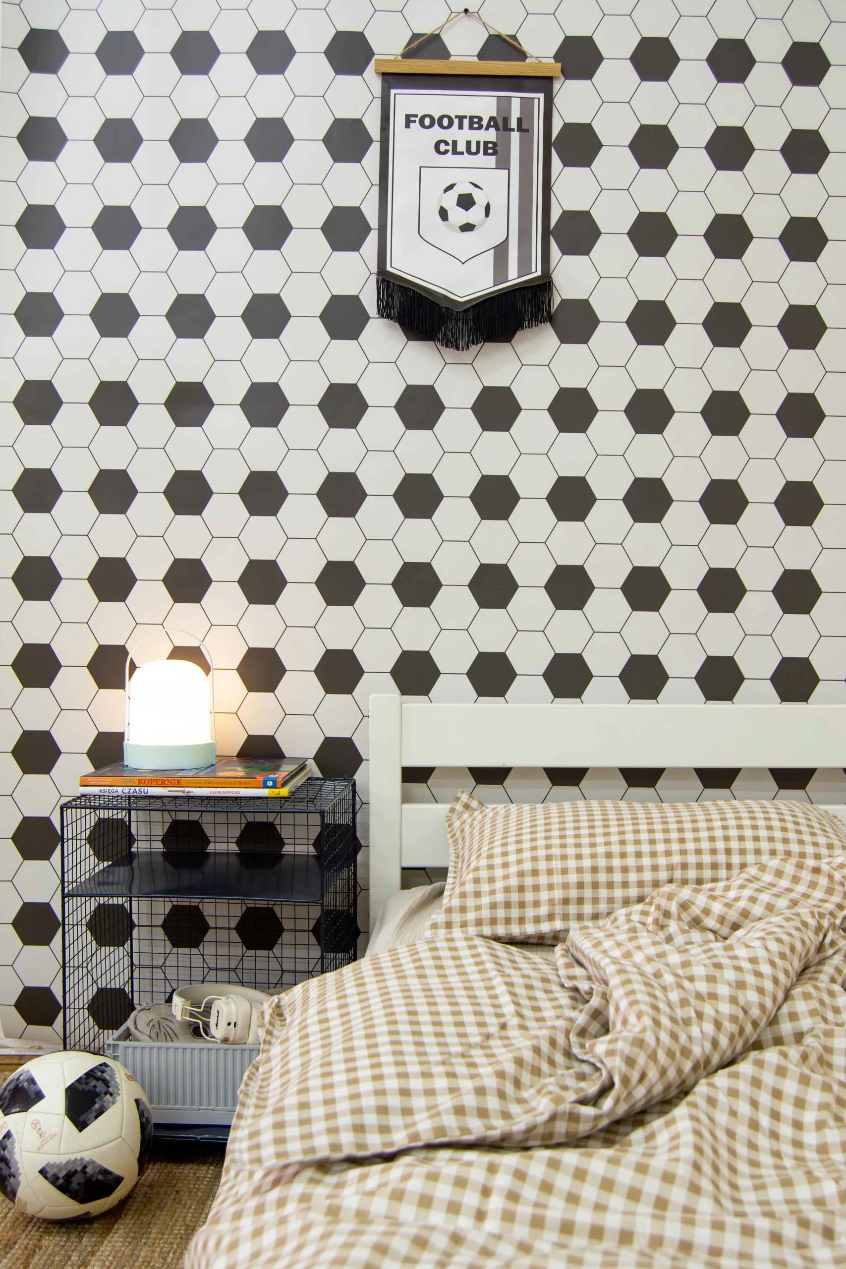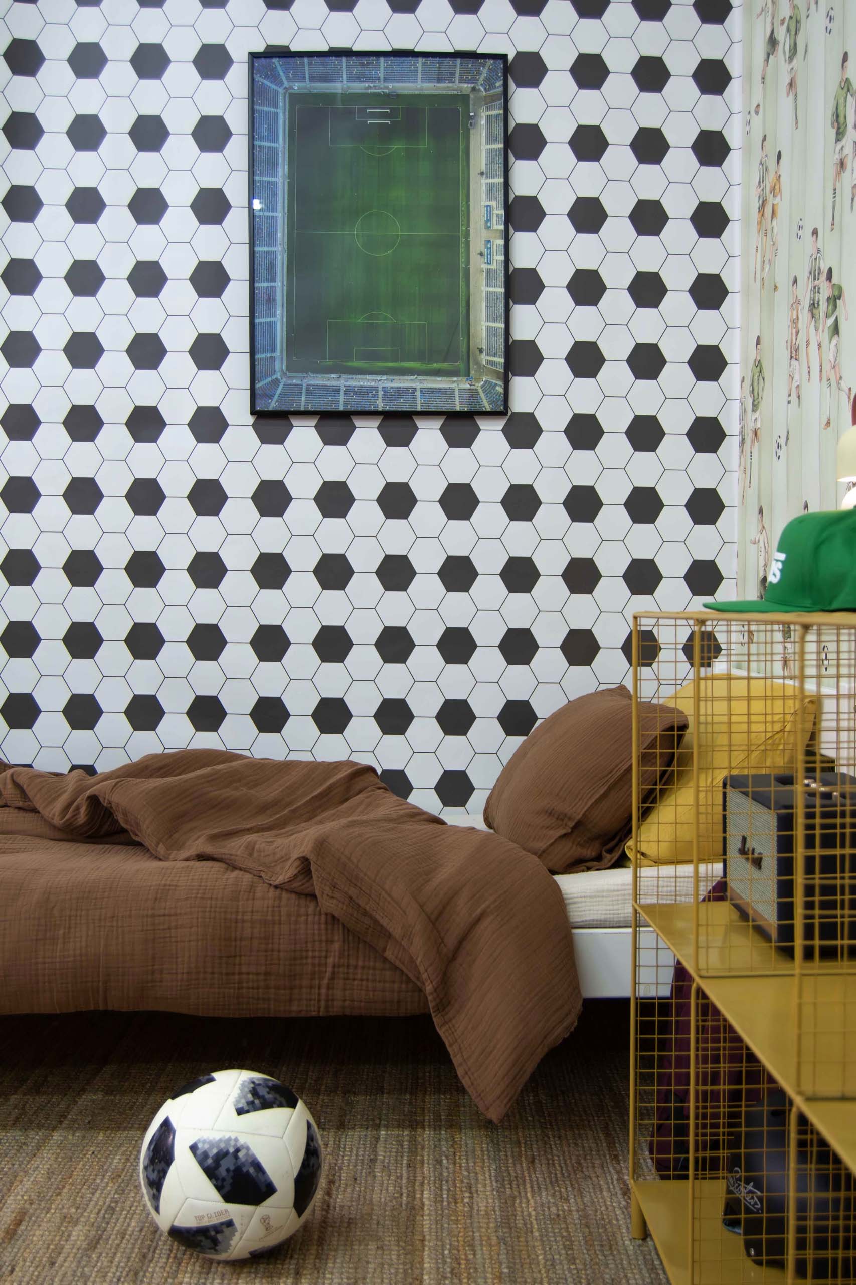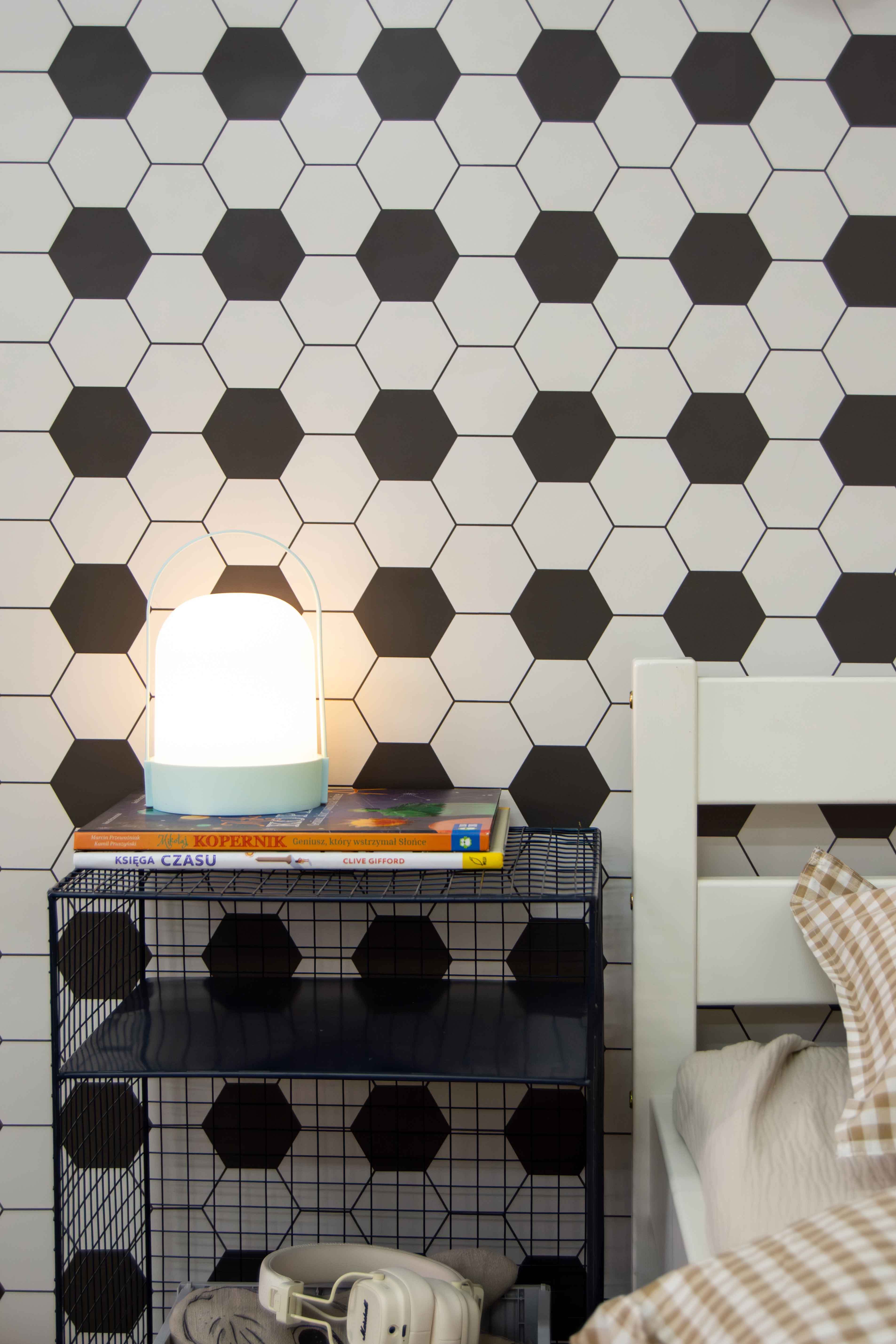 Co ważne, wzór heksagonów świetnie sprawdza się również jako uzupełnienie drugiej ściany w pokoju – np. w połączeniu z tapetą z sylwetkami piłkarzy. Takie zestawienie tworzy spójną, tematyczną całość, która nawiązuje do świata sportu, a jednocześnie pozwala zachować estetyczną równowagę i lekkość we wnętrzu.