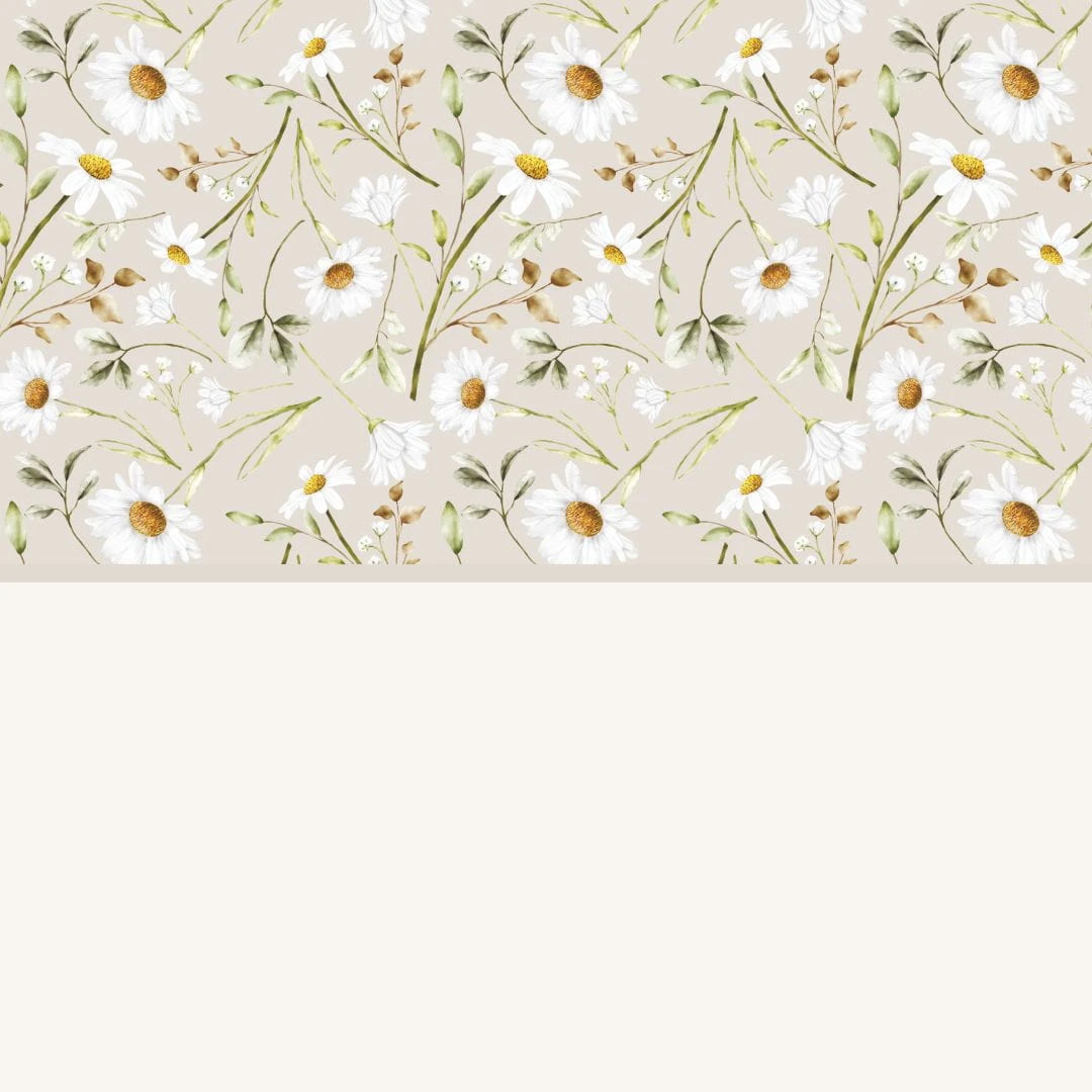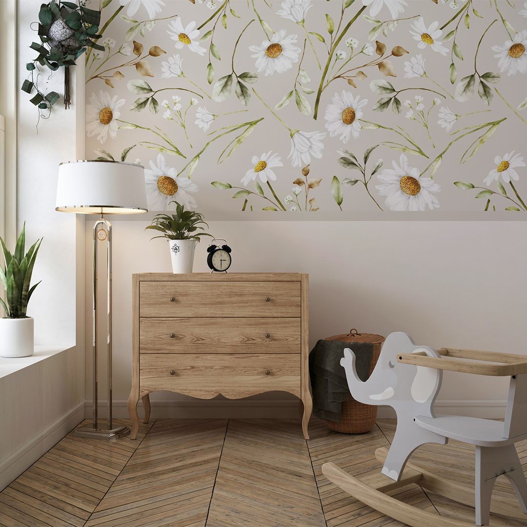 Tapeta winylowa na podkładzie flizelinowym z motywem pasków w formie lamperii z kwitnącym rumiankiem w górnej części wzoru.
