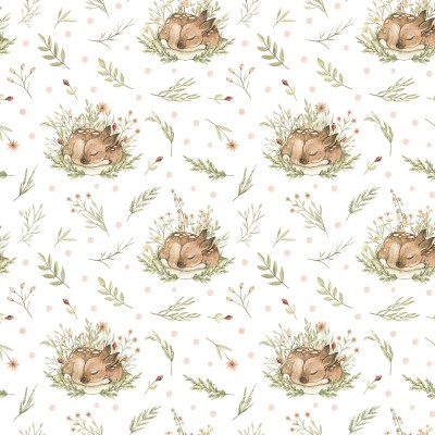 Sarenkowy sen to delikatny wzór przedstawiający śpiące sarenki na białym tle z odrobiną zieleni.