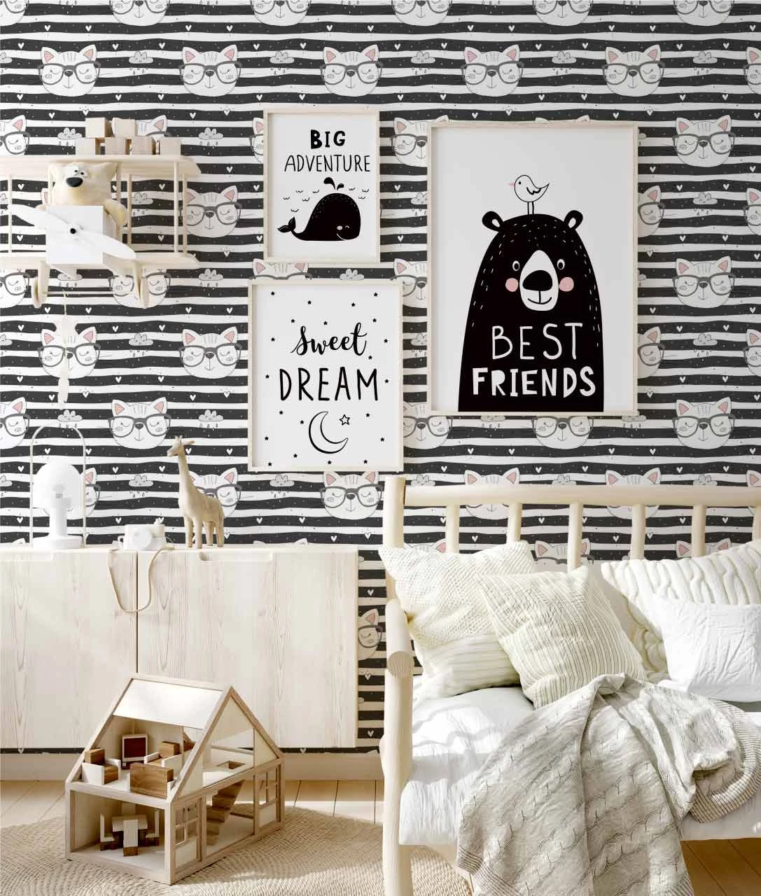 Tapeta "Śpiące kotki" prezentuje pasiastą ilustrację z drzemiącymi mruczkami, która pobudzi zmysł wzroku i wyobraźnię maluszka.