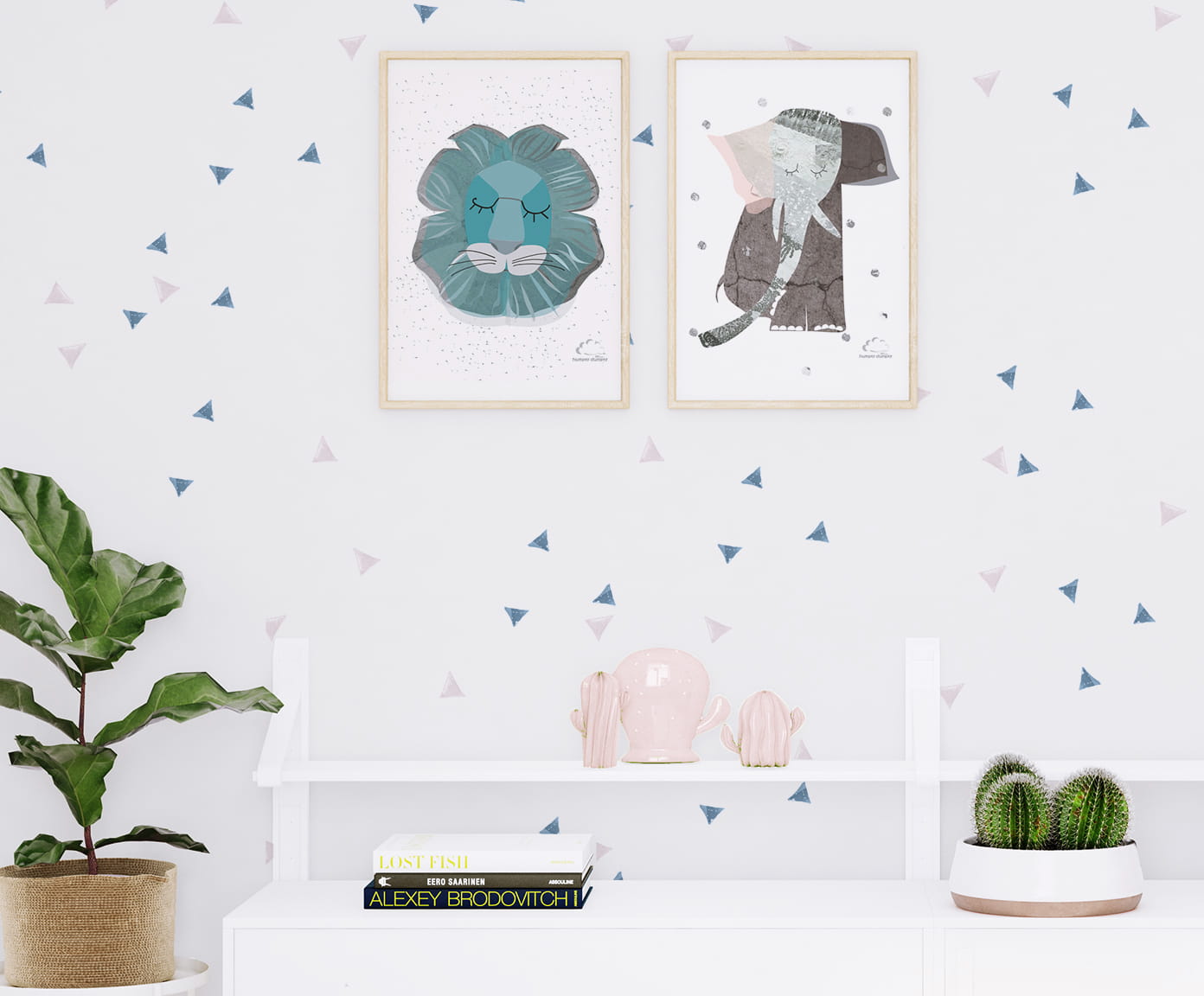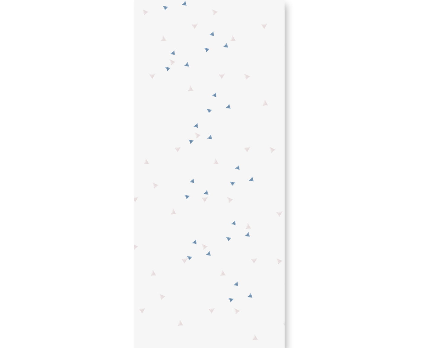 Elementy wzoru to rozrzucone trójkąciki w pastelowych kolorach różu i błękitu.