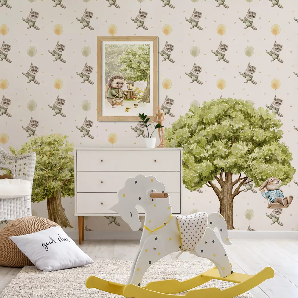 Niezły odlot z bohaterem kolekcji Opowieści z Leśnej Chaty. Subtelna kolorystyka tapety przełamana akcentem żółtego balonika.