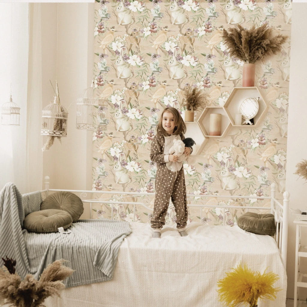 Prezentowana tapeta – ze względu na obecność kwiatów – spodoba się bardziej dziewczynkom. Doskonale zgra się jednak z wnętrzami w leśnym stylu, w których akcent położony jest na bliskość z naturą. Ciekawy efekt osiągniesz, łącząc ją również z dodatkami w stylu rustykalnym, które emanują energią prawdziwego lasu.