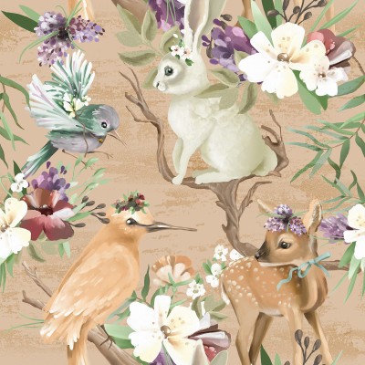 Któż z nas nie marzył, aby znaleźć się kiedyś w baśniowym lesie? Cóż, prezentowana dekoracja ścienna daje nam taką możliwość… Wystarczy tylko „włączyć” wyobraźnię! Pełna finezji tapeta utrzymana jest w brązach, jednak purpurowe i kremowe kwiaty przełamują dominującą kolorystykę, wnosząc świeżość i urok do pokoiku dziecięcego.