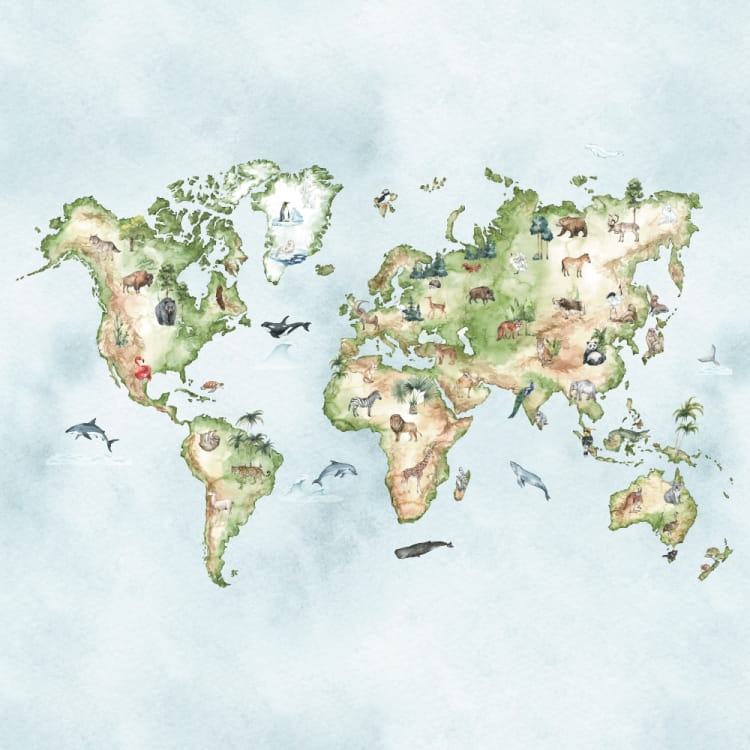 Z tapetą Mapa świata w pięknej kolorystyce lasów i mórz w ciekawy sposób wkroczycie w wielki świat, a towarzystwo zwierząt umili wspólne poznawanie odległych terenów.