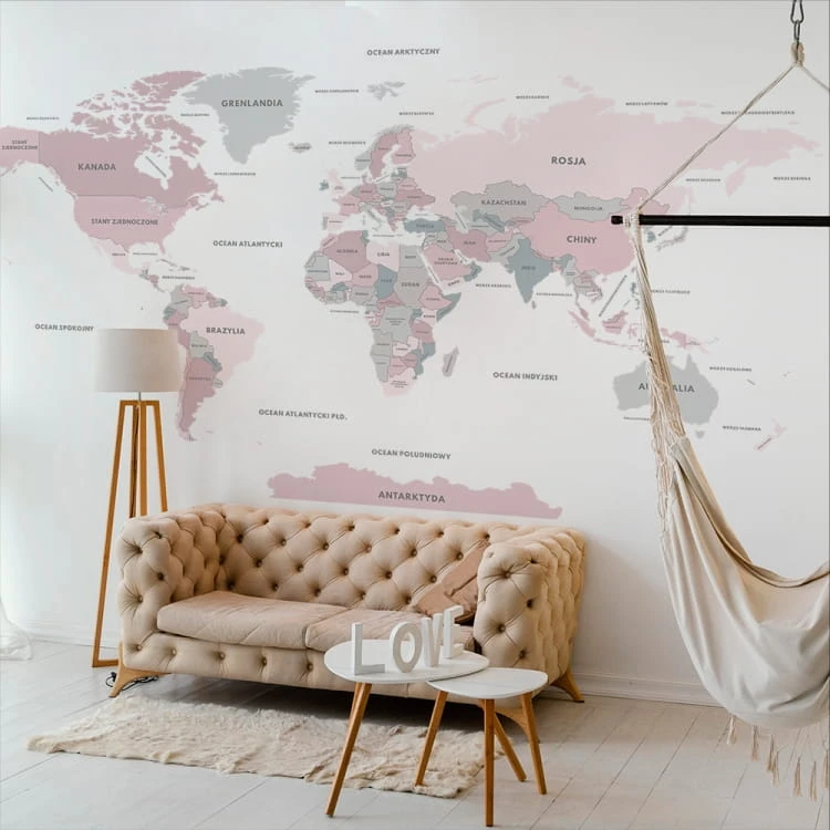 Z tapetą Mapa świata w kolorze różowym w ciekawy sposób wkroczycie w wielki świat, a towarzystwo zwierząt umili wspólne poznawanie odległych terenów.