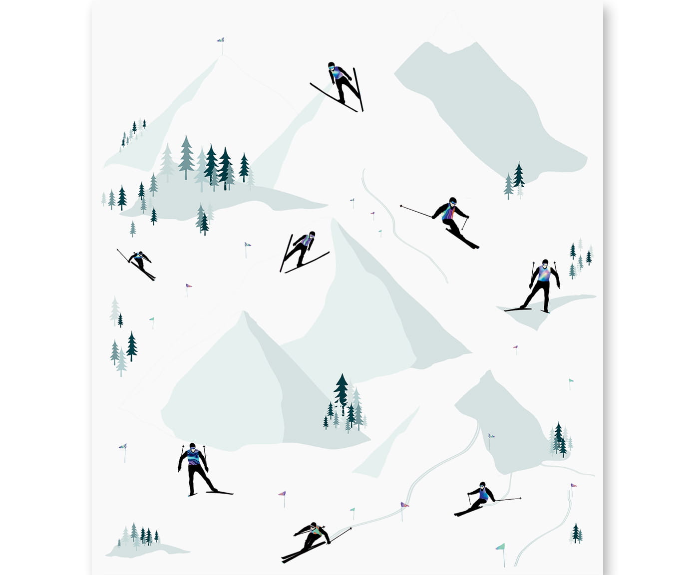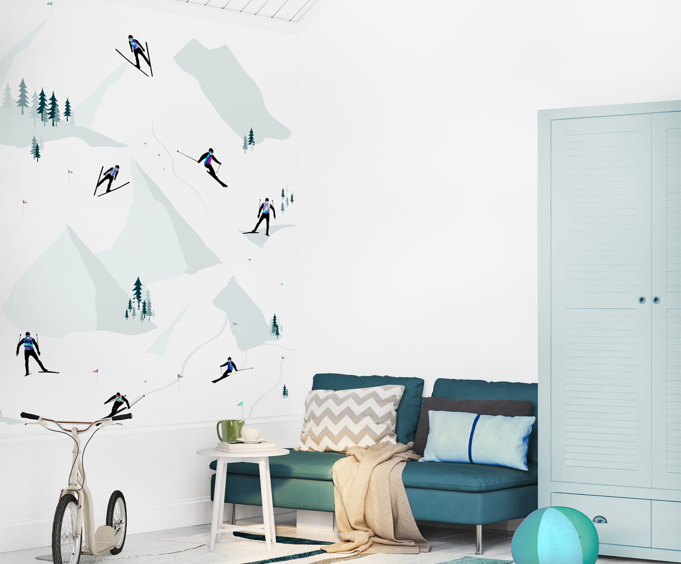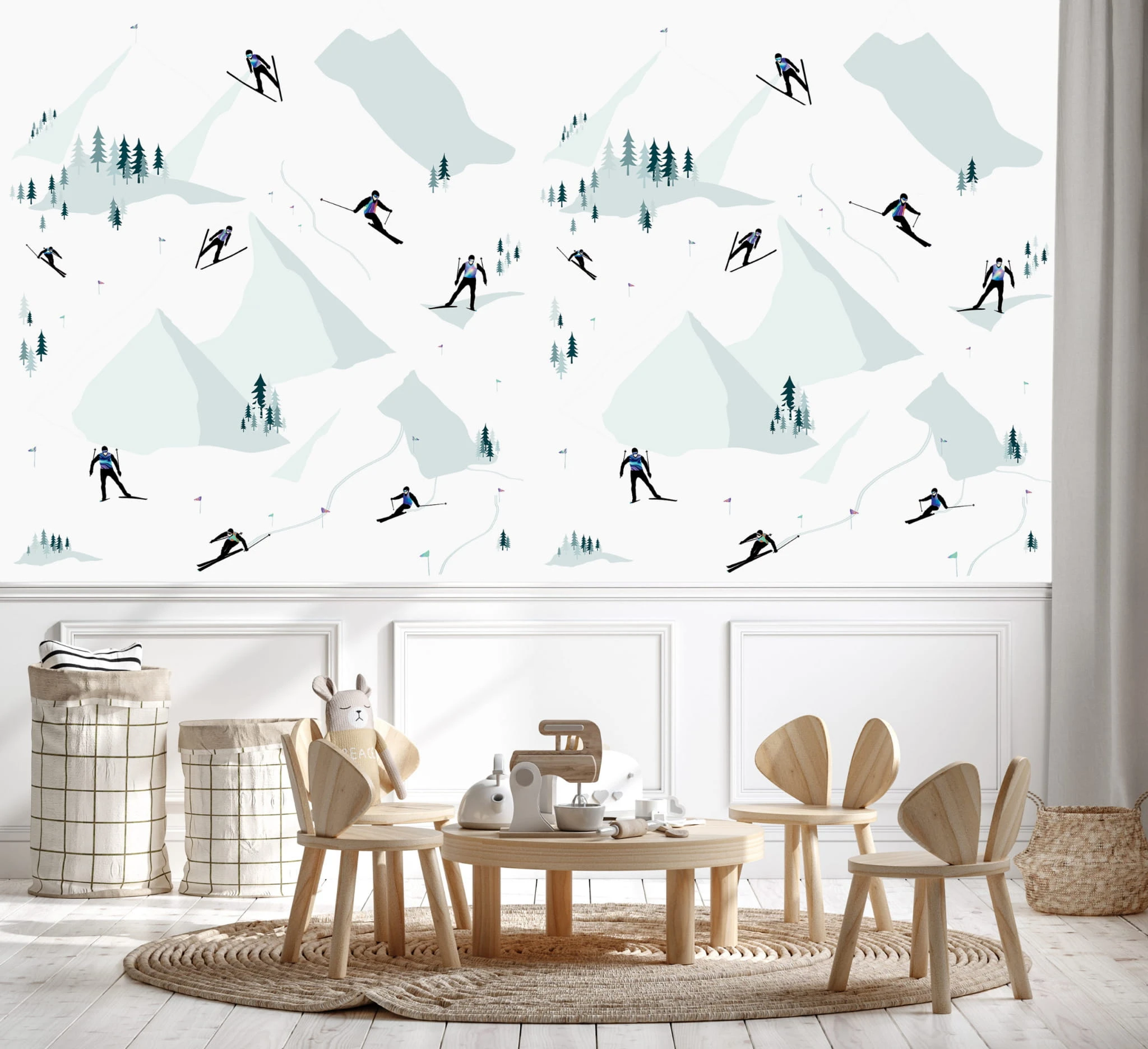 Tapeta dla dzieci Skiing to oryginalna tapeta dekoracyjna ze zjazdami narciarskimi.