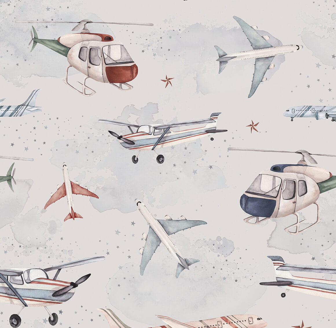 Twój maluch uwielbia latać myślami poza horyzontem? Nasza tapeta zachwyci go różnorodnością realistycznych samolotów i helikopterów! Tapeta nada pomieszczeniu niesamowity charakter, rozbudzi wyobraźnię małego pilota i zachęci go do snucia fantastycznych historii na tle nieba i chmur.