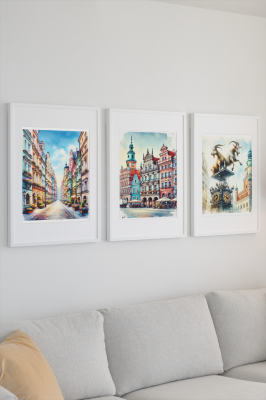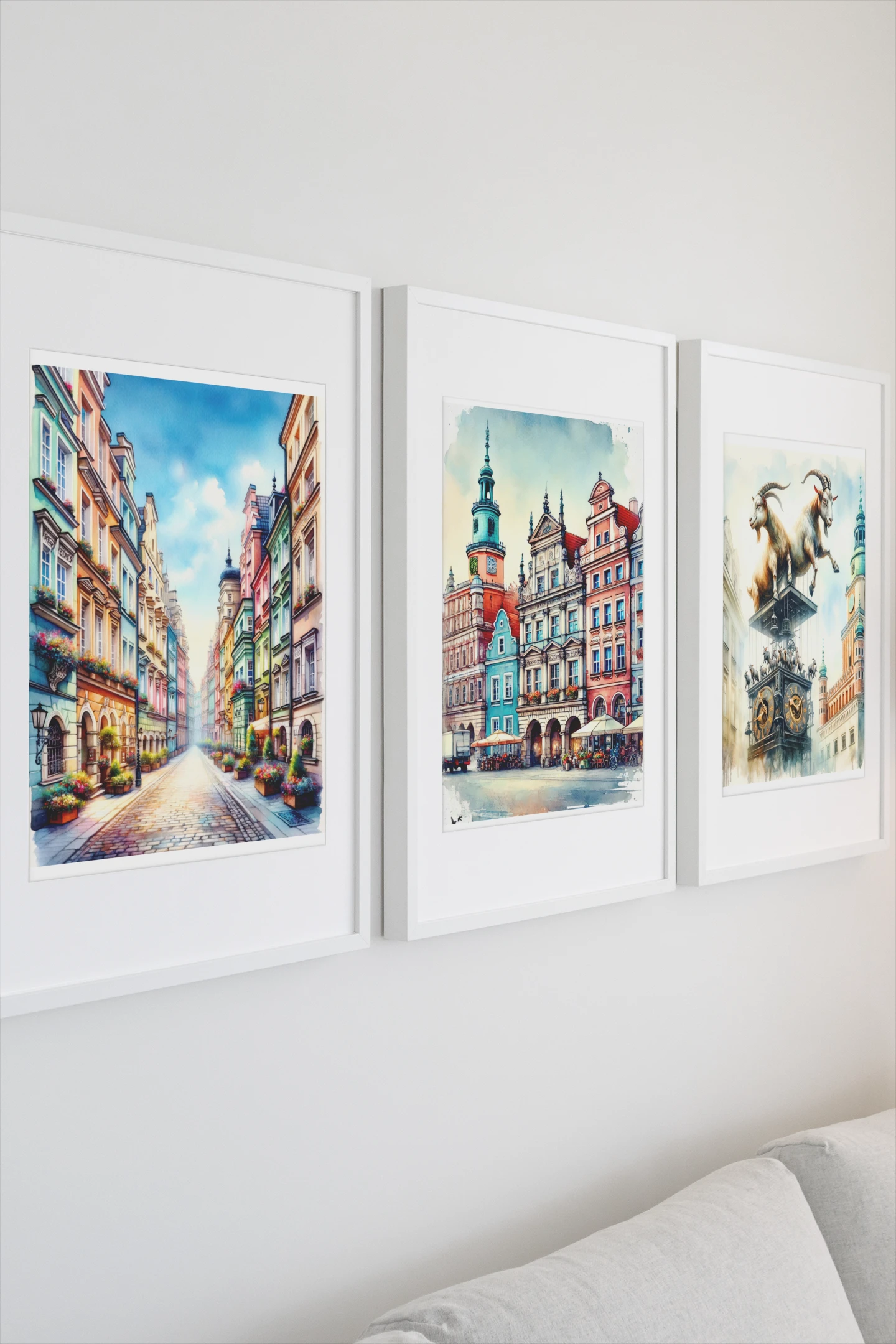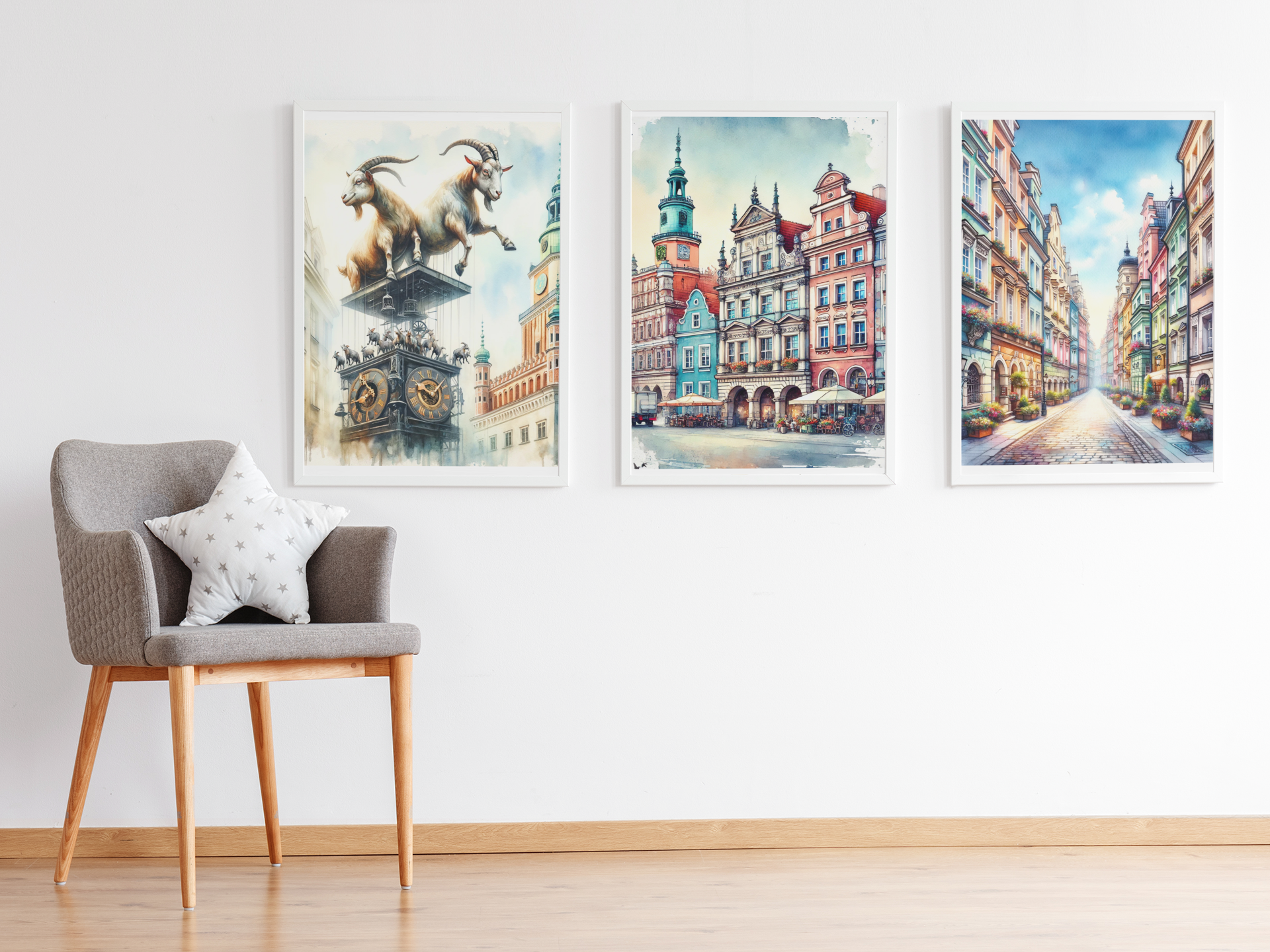 Przenieś klimat stolicy Wielkopolski do swojego wnętrza dzięki zestawowi trzech plakatów z Poznania. Na ilustracjach zobaczysz kolorowe kamienice Starego Rynku, piękny Ratusz oraz słynne poznańskie koziołki – symbole miasta. Każdy plakat został wykonany w akwarelowej stylistyce, która nadaje całości lekkości i artystycznego charakteru.