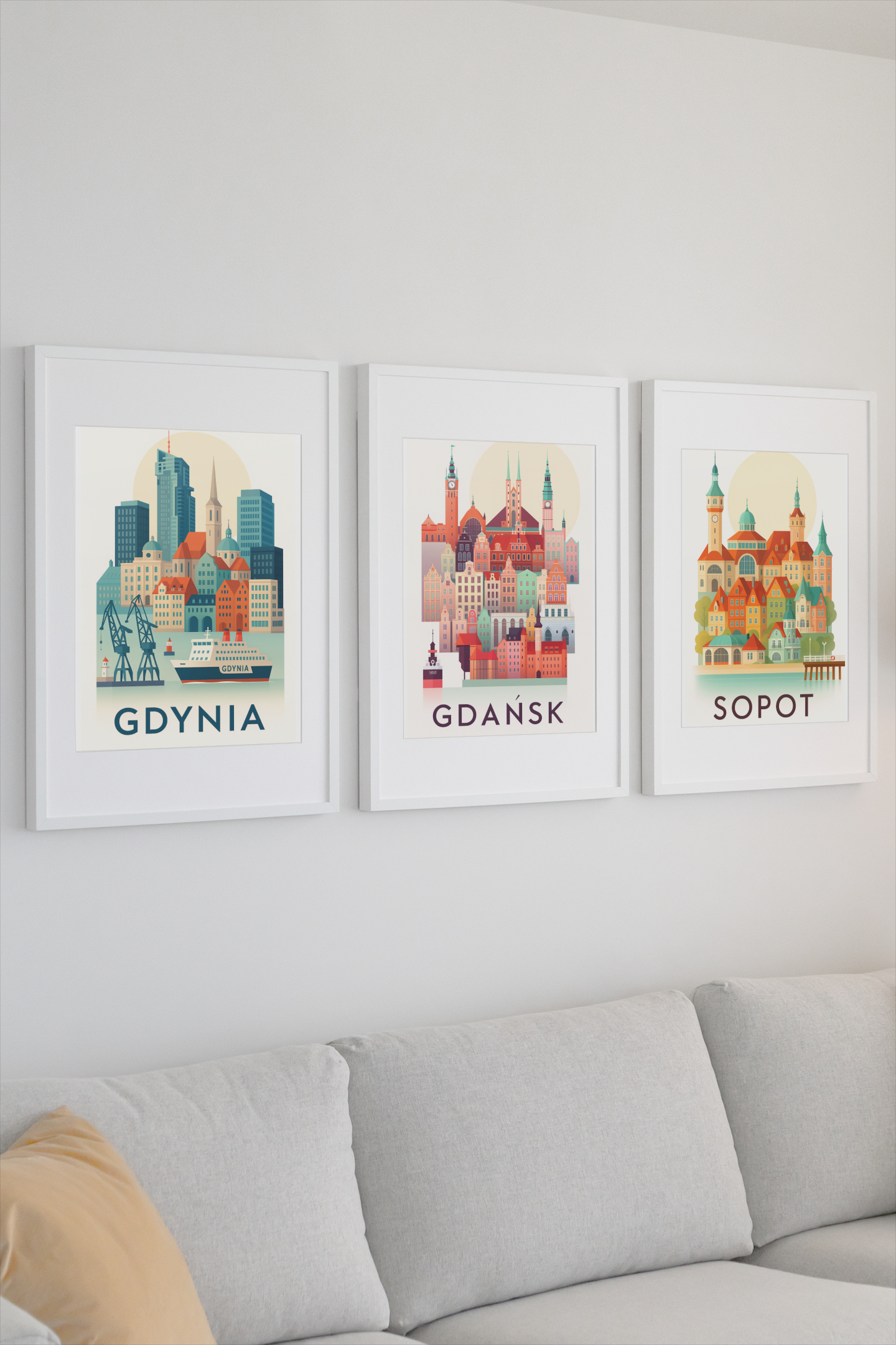 Odkryj wyjątkowy klimat Trójmiasta dzięki zestawowi trzech plakatów przedstawiających Gdynię, Gdańsk i Sopot. Każdy z nich został zaprojektowany w nowoczesnym, ilustracyjnym stylu, który łączy pastelowe barwy z charakterystycznymi elementami architektury i atmosfery nadmorskich miast.